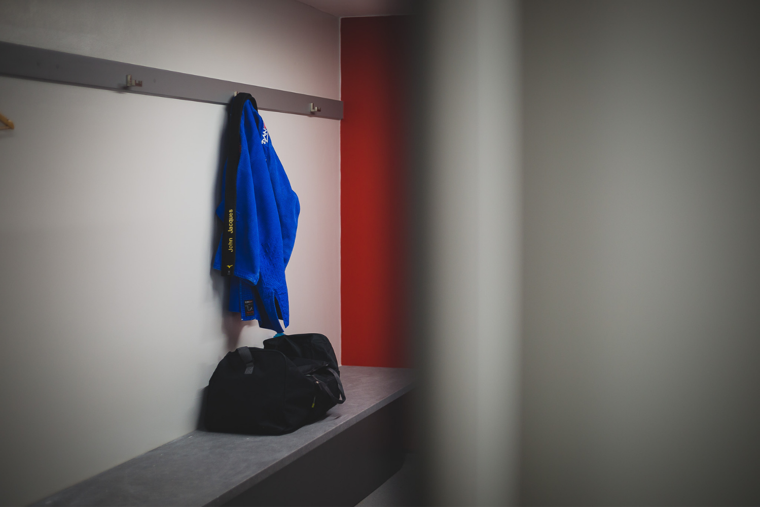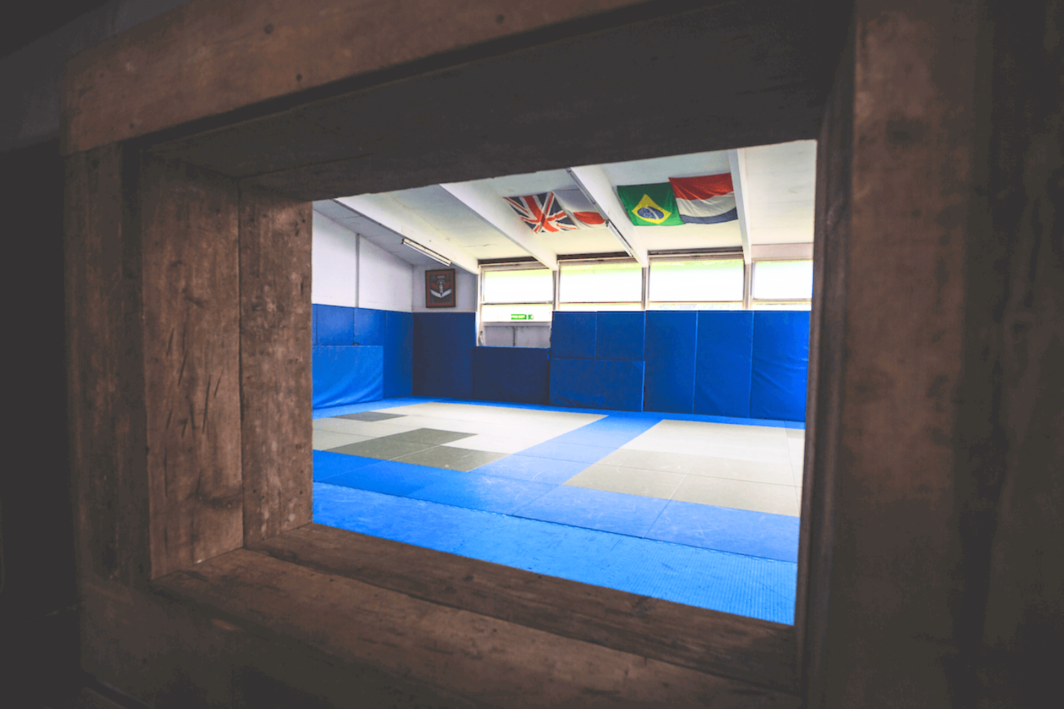 A versatile 11 m × 9 m space featuring a fully matted 40 mm sprung floor and wall-clad matting. The dojo includes a seating area alongside the mat, a double-door entrance, and a reception desk. Independent changing rooms are available for use.
